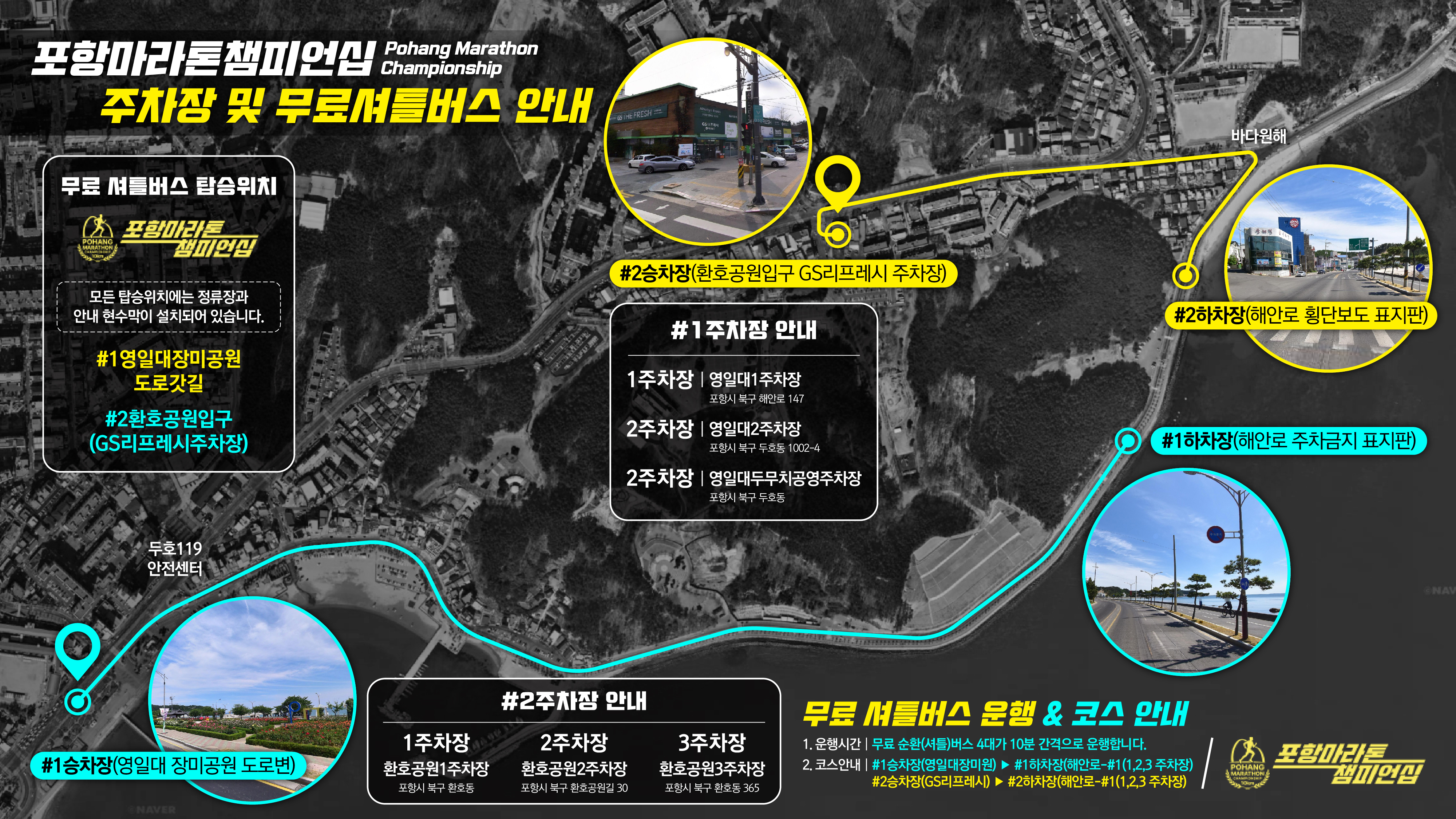 📍1. 셔틀버스 정류장 인근주차장 1주차장: 영일대1주차장 (포항시 북구 해안로 147) 2주차장: 영일대2주차장 (포항시 북구 두호동 1002-4) 3주차장: 영일대두호지구공영주차장 (포항시 북구 두호동 1015-1) 📍2. 셔틀버스 정류장 인근주차장 1. 환호공원1주차장: 포항시 북구 환호동 323-3 2. 환호공원2주차장: 포항시 북구 환호공원길 30 3. 환호공원3주차장: 포항시 북구 환호동 365 ___________________________________________________________________________________ 🚌 무료 셔틀버스 운행 안내 📍운행구간: #1승차장(영일대 장미공원 도로변) ↔ #1하차장(해안로 주차금지 표지판) #2승차장(환호공원입구 GS리프레시 주차장) ↔ #2하차장(해안로 횡단보도 표지판) 📍운행시간: 오전 07:00~08:30 (약 10분 간격 수시 운행) 오전 11:30~13:00 (약 10분 간격 수시 운행, 대회장에서 바로 출발) 📍비고 - 모든 승·하차 지점에는 정류장과 안내 현수막이 설치되어 있습니다. 🚫 행사장 주변은 주차가 불가하오니 반드시 지정된 주차장과 셔틀버스를 이용해주시기 바랍니다. 여러분의 안전하고 쾌적한 대회 참여를 위해 협조 부탁드립니다. "추후 셔틀버스 인근주차장 추가확보시 공지예정" |