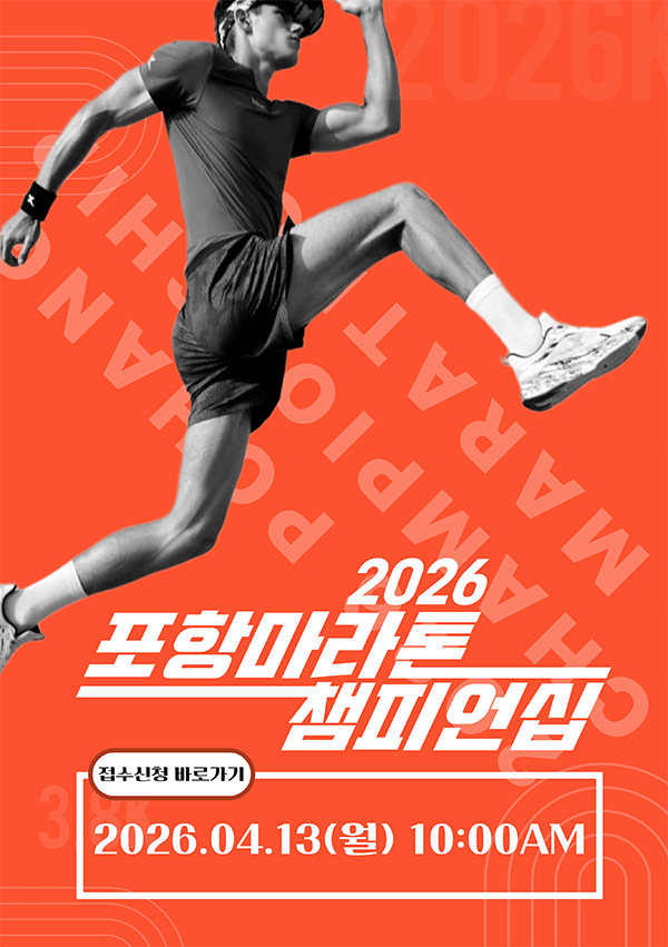 2026 포항마라톤 챔피언십 개인참가신청 단체참가신청 대회일시 2026년 11월 7일 (토) 09시 (집결 8시) 대회장소 집결지 : 영일대해상누각 참가부문 10KM, 5KM 접수기간 2026년 4월 13일 부터 선착순 7,000명