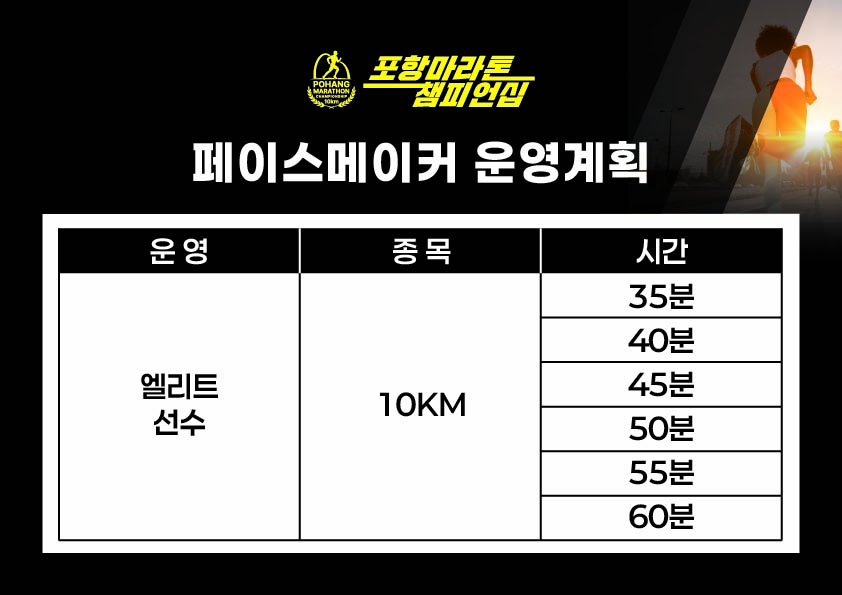 ☞정해진 페이스를 유지하여 자신만의 목표 기록을 도달할수 있도록 엘리트 선수들이 함께 달립니다. ☞참가자들이 목표 시간에 완주 및 일정한 페이스를 유지하며 달릴수 있도록 엘리트 선수들이 시간대별로 배치됩니다. |