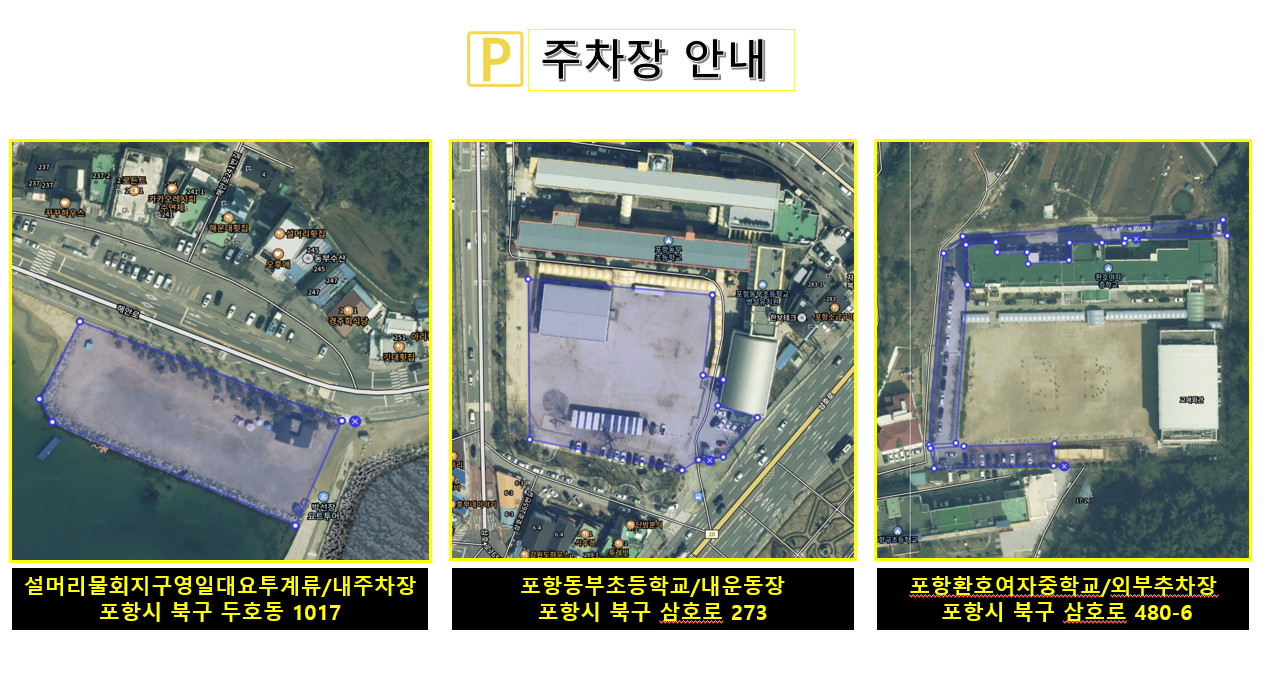 ※ 주차장 안내 ※ #2주차장 ☞ 환호공원3주차장 (대회기간중 타워주차장 공사계획 사용불가) #2주차장 ☞ 포항환호여자중학교 (외부주차장 사용) #1주차장 ☞ 포항동부초등학교 (운동장 사용) #1주차장 ☞ 설머리물회지구(영일대)요트계류장 (내부주차장 사용) |